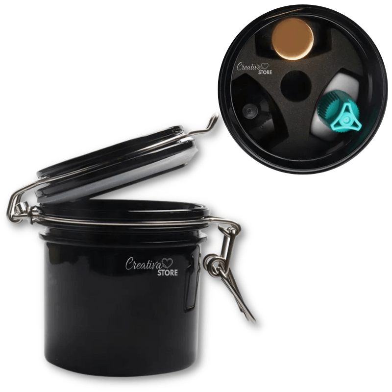 contenedor negro hermético que mantiene el pegamento de pestañas alejado de la humedad.